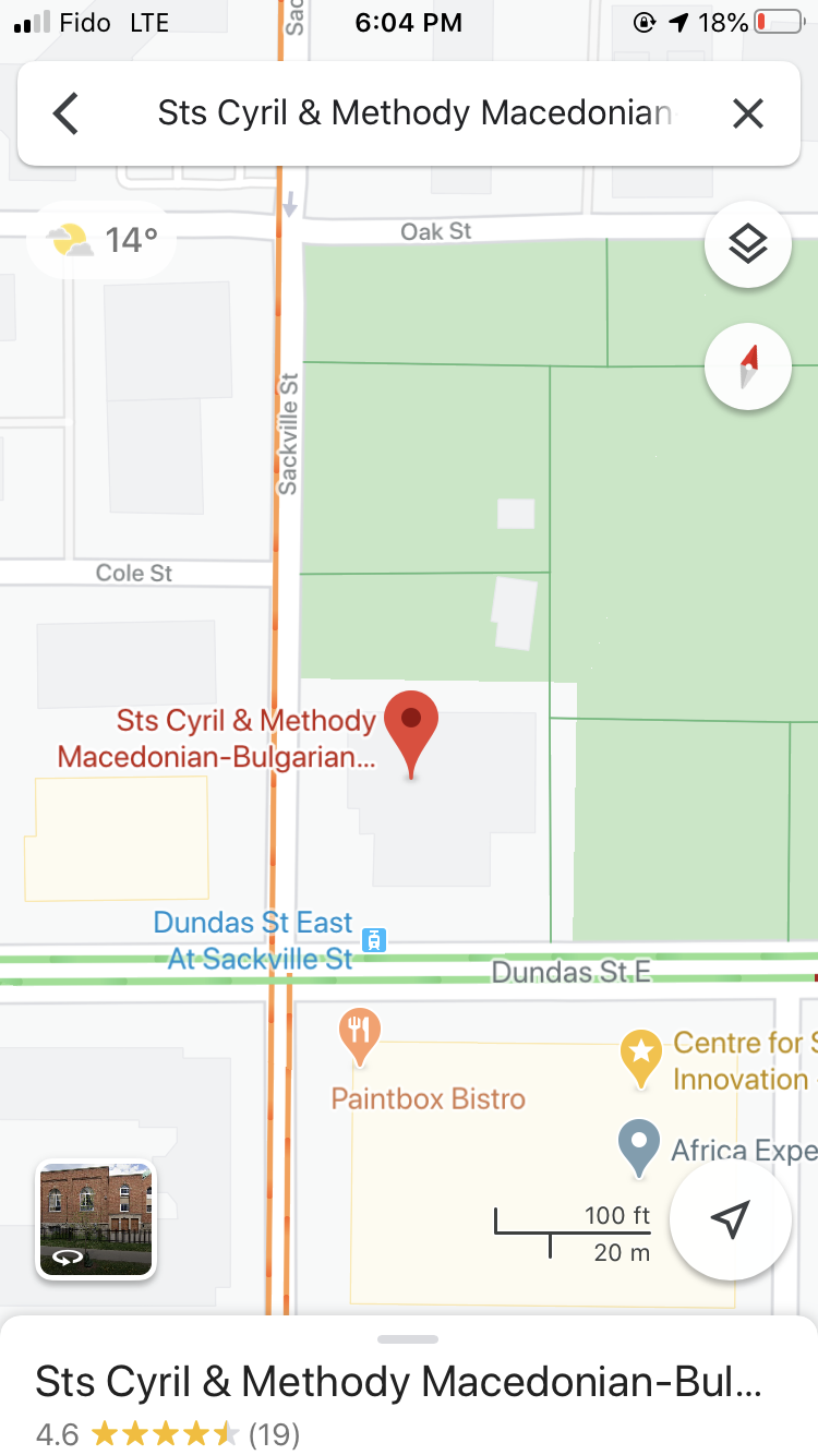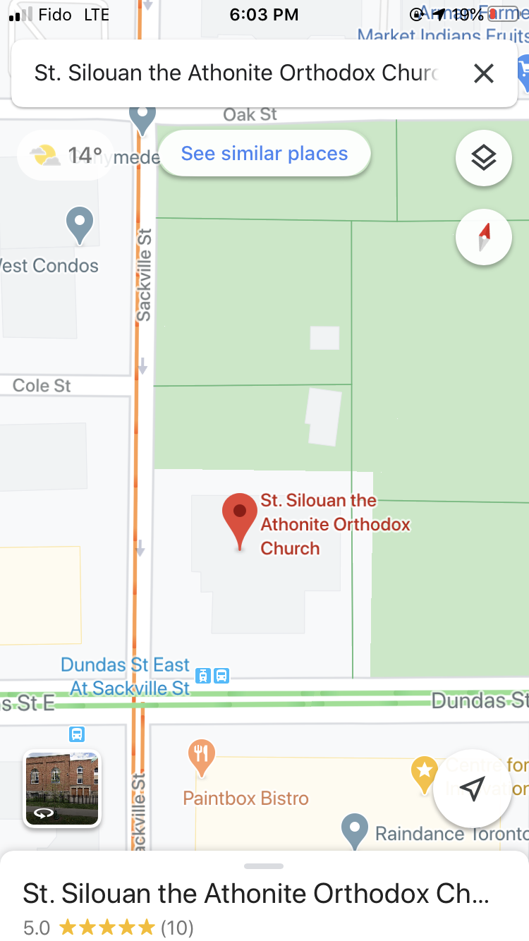 Maps showing Sts. Cyril and Methody and St. Silouan occupying the same physical building at Dundas and Sackville