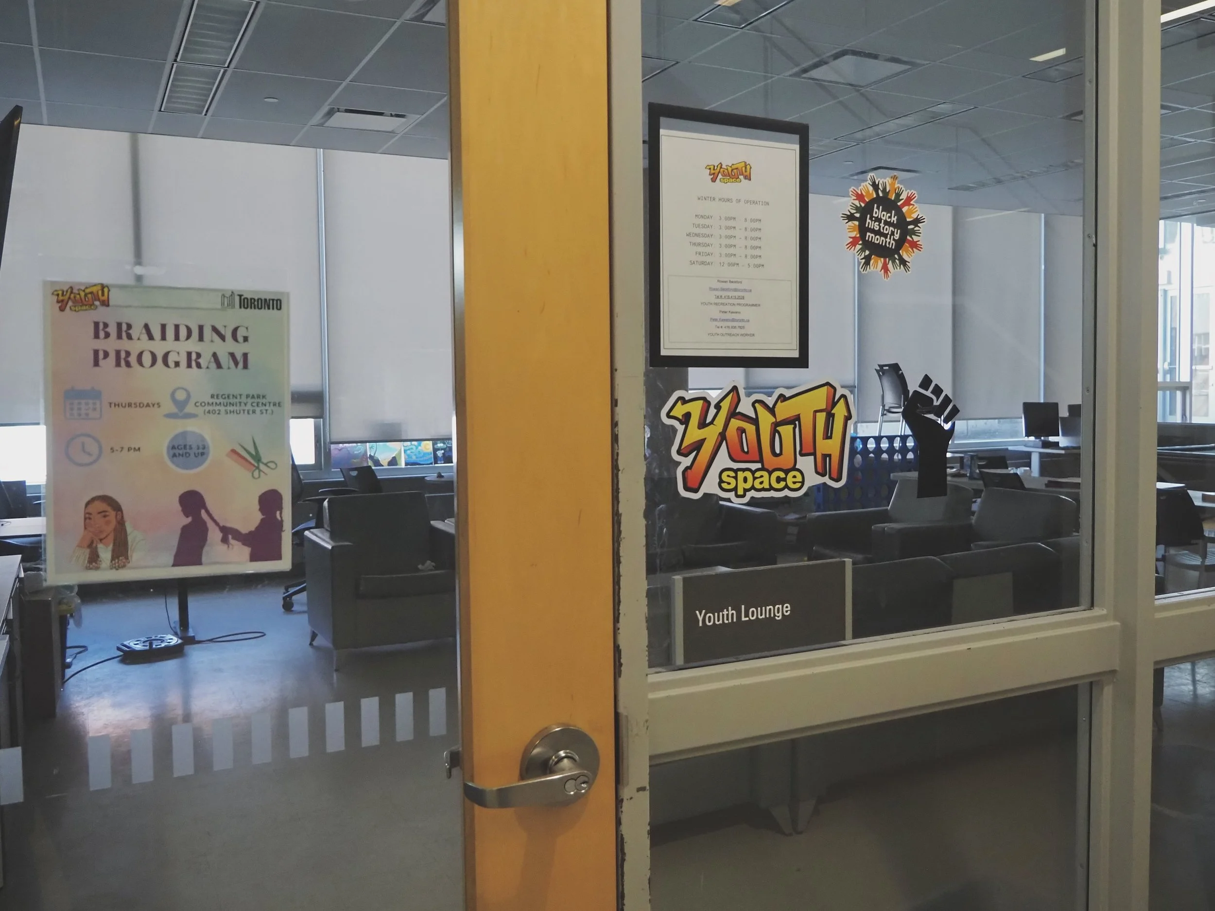I asked the staff at the front desk where the drop-in happened and they pointing me to the Youth Zone room down the hall. The room was mainly glass, new and fresh. It seemed to be full of new furniture, a TV, white boards. Some surfaces saw stickers — “Youth Zone,” “Black History Month,” a raised fist — but overall the room was clean and airy. I sat and waiting on the bench in the hall outside. Waiting for noon and just people watching. Two staff members, both in their green shirts and probably in high school, casually chatted. I imagined them flirting. A toddler lumbering after a soccer ball that had escaped the gymnasium family play time. People coming and going from the gym upstairs. It was a busy place on a Saturday morning.